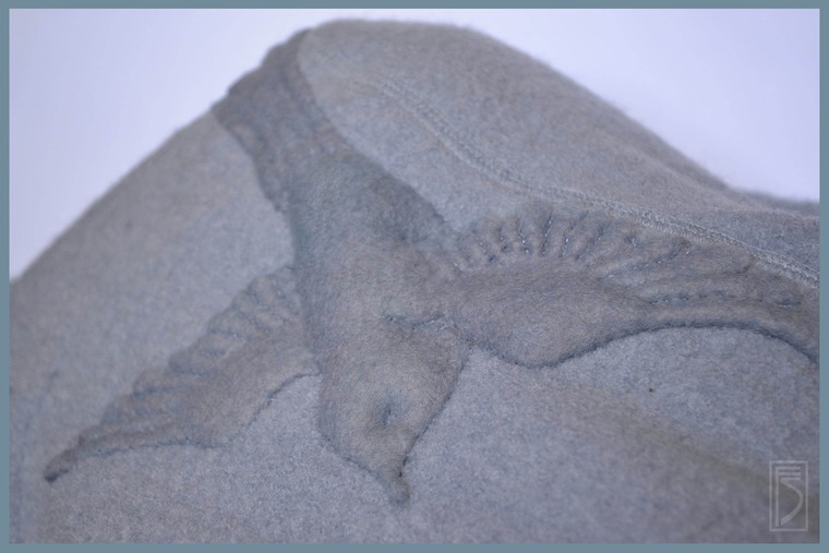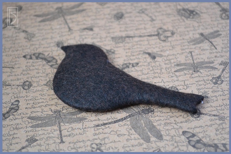 Набиваем и точечно прихватываем в нескольких местах фетр на крыльях и хвосте: