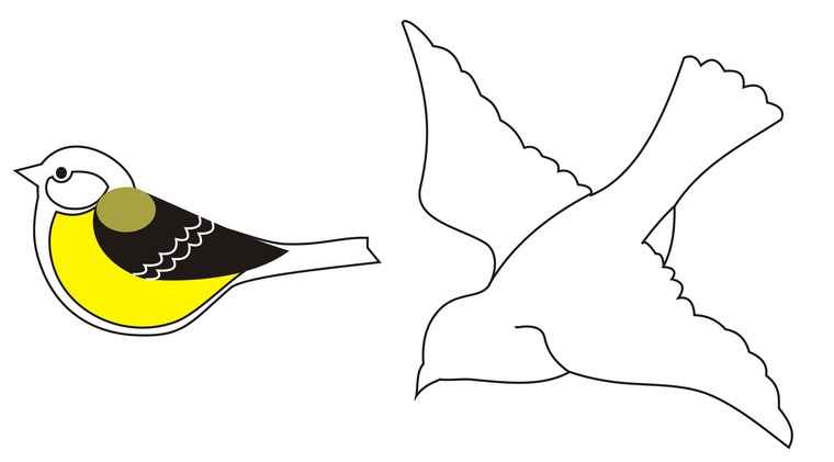 Вырезаем две детали птички из картона и две с припусками от 5 до 8 мм из текстиля: одну из фетра и одну из тонкой хлопковой ткани для изнаночной стороны броши.