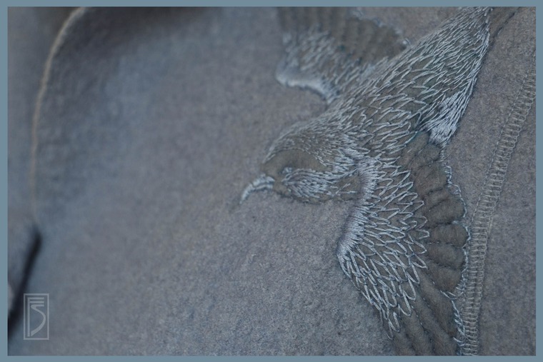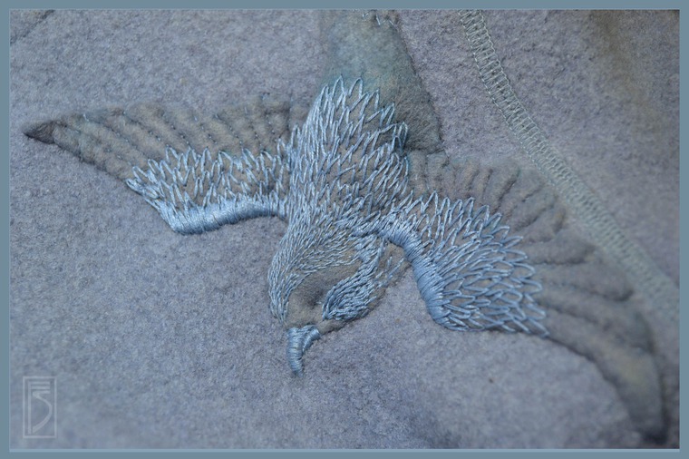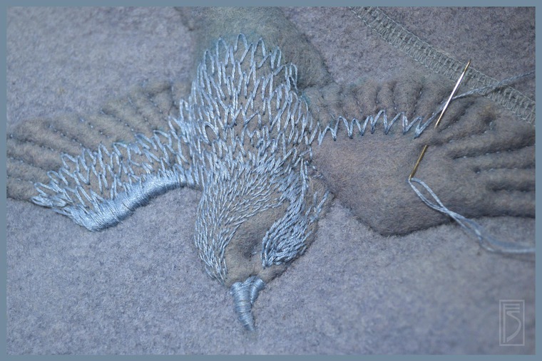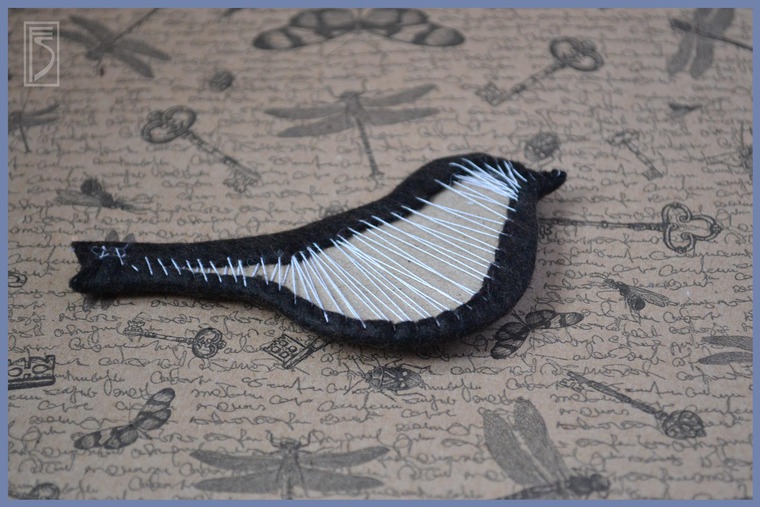 Пришиваем белую и черную детали затем пришиваем его к птице и вышиваем несколько "перышек", сверху пришиваем оливковое пятнышко и добавляем немного штрихов простым наметочным швом на голове и грудке, хвост вышиваем стебельчатым швом: