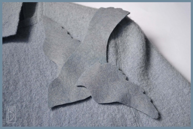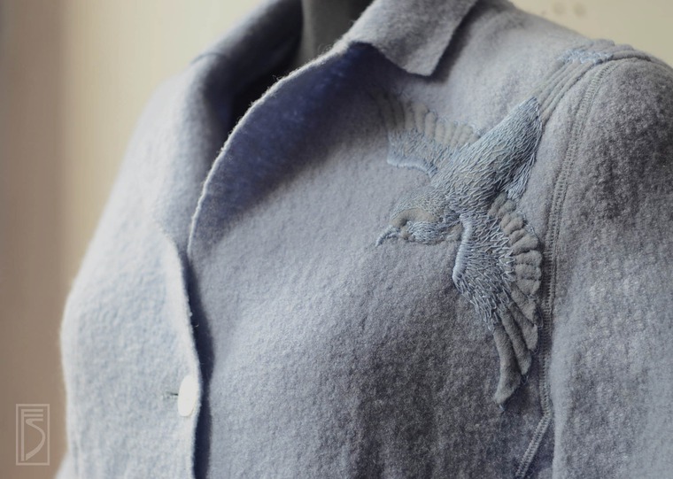 Прикалываем булавками фетр и подгибая пришиваем потайным швом к жакету, оставляя непришитыми нижние кромки крыльев и хвоста: