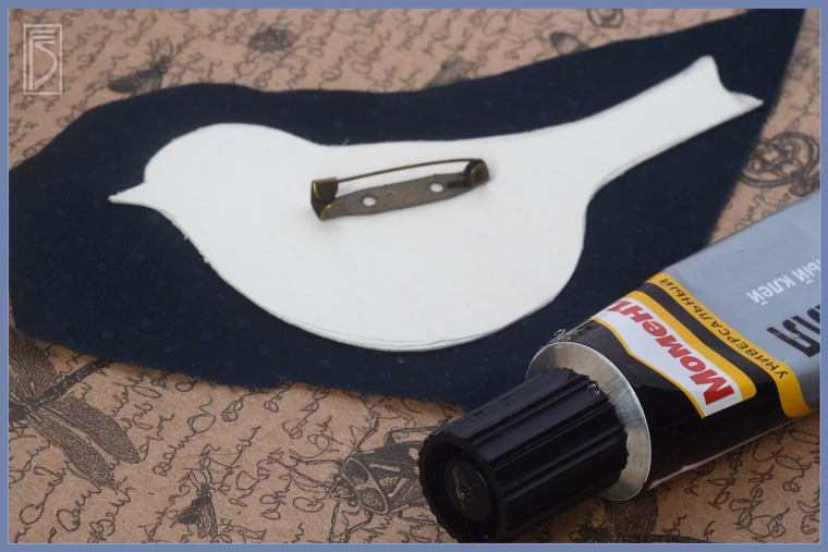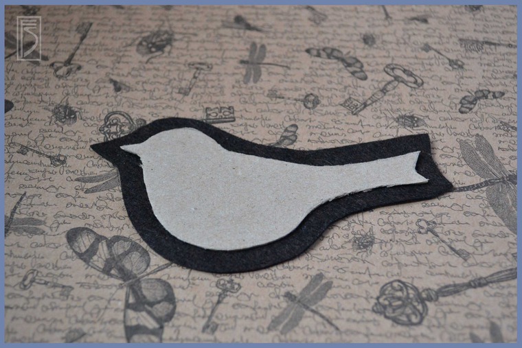 6. Вырезаем из картона контур птички, картон должен быть на 2 — 3 мм. меньше изделия. Хорошо промазываем фетр, сторону, где видны нити — это закрепит их и придаст прочность вашей будущей броши.