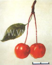Покровная окраска на большей части плода в виде яркого румянца малинового цвета. Мякоть плодов белая, зеленоватая, плотная, колющаяся, крупнозернистая, кисло-сладкого приятного вкуса. Оценка внешнего вида плодов и дегустационная — 4,3 балла.
